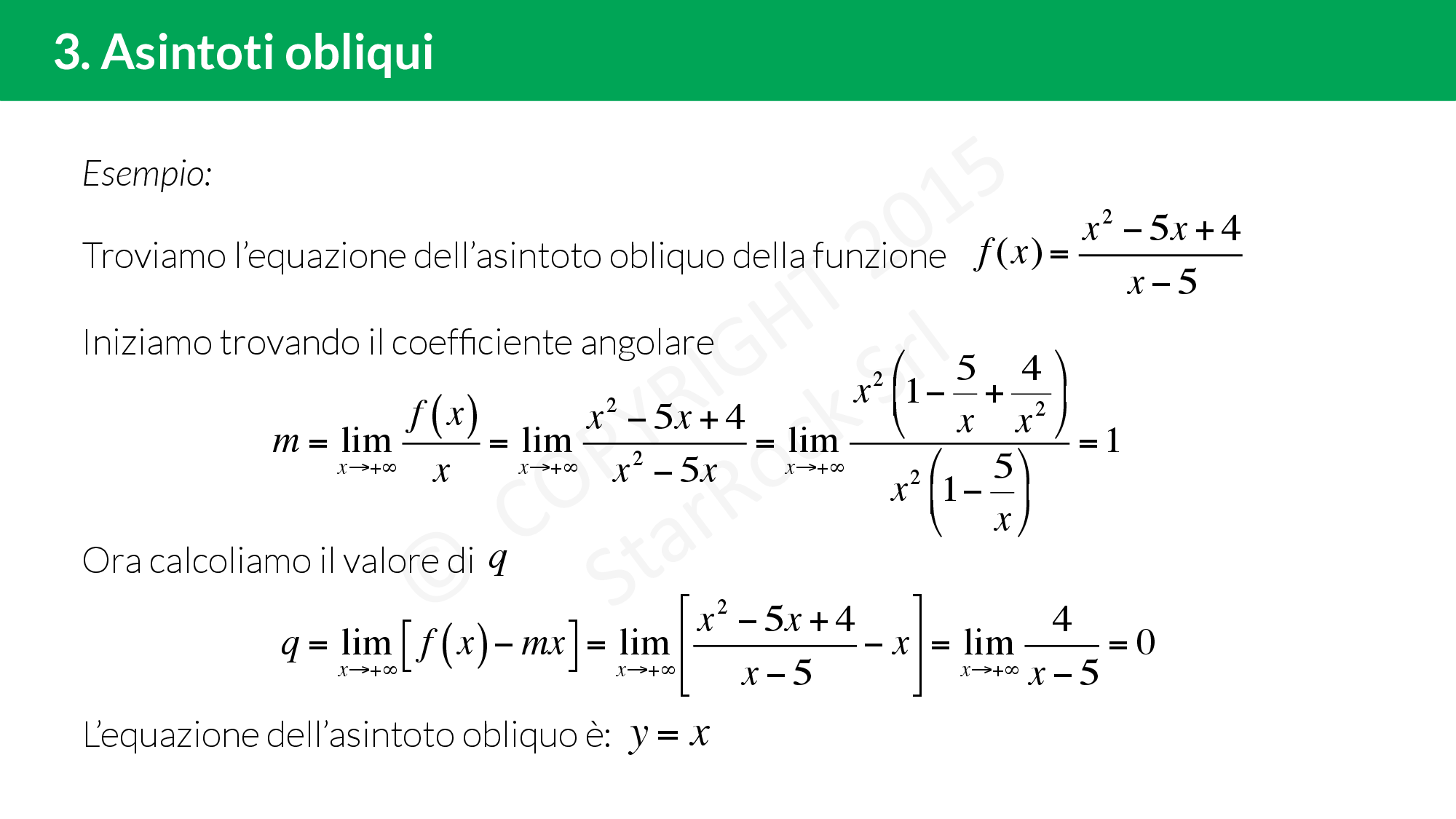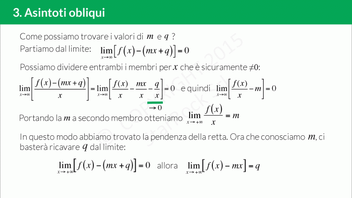 - Se esiste l’£$m$£, puoi calcolare anche l’intercetta dell’asintoto obliquo £$q$£: £$q=\lim\limits_{x \to \infty} \left[ f(x)-mx \right]$£.