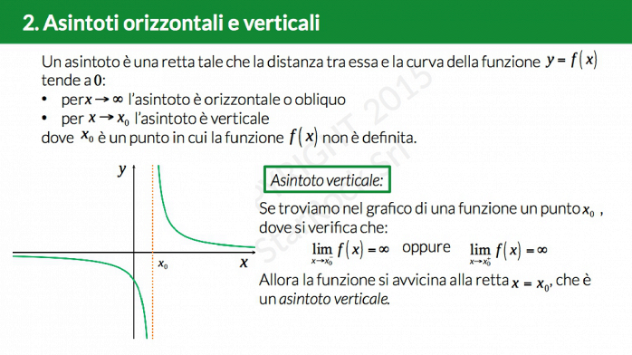 - un asintoto verticale se £$\lim\limits_{x \to x_0} f(x)= \infty$£. La retta £$x=x_0$£ è un asintoto verticale per la funzione £$f(x)$£