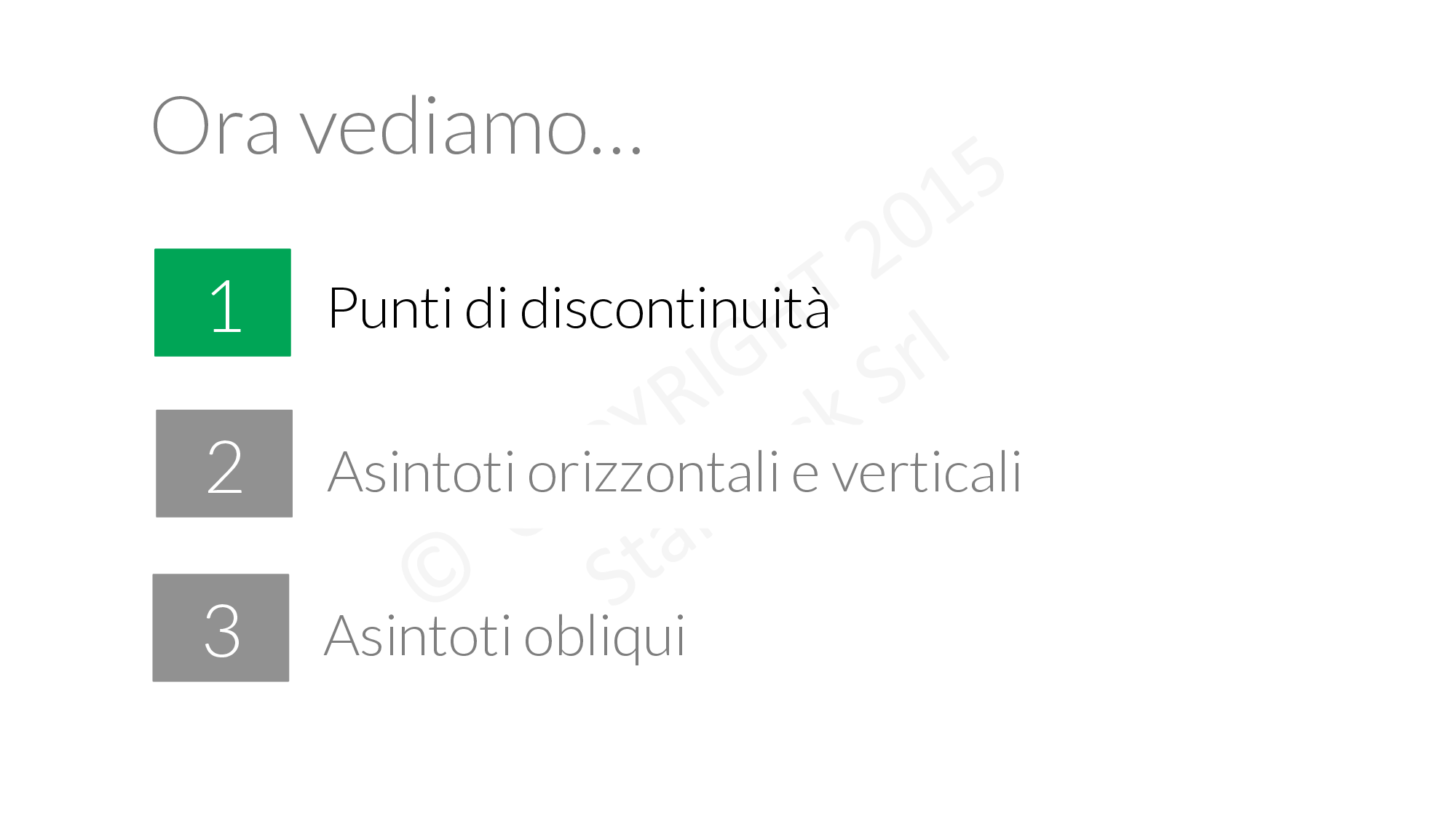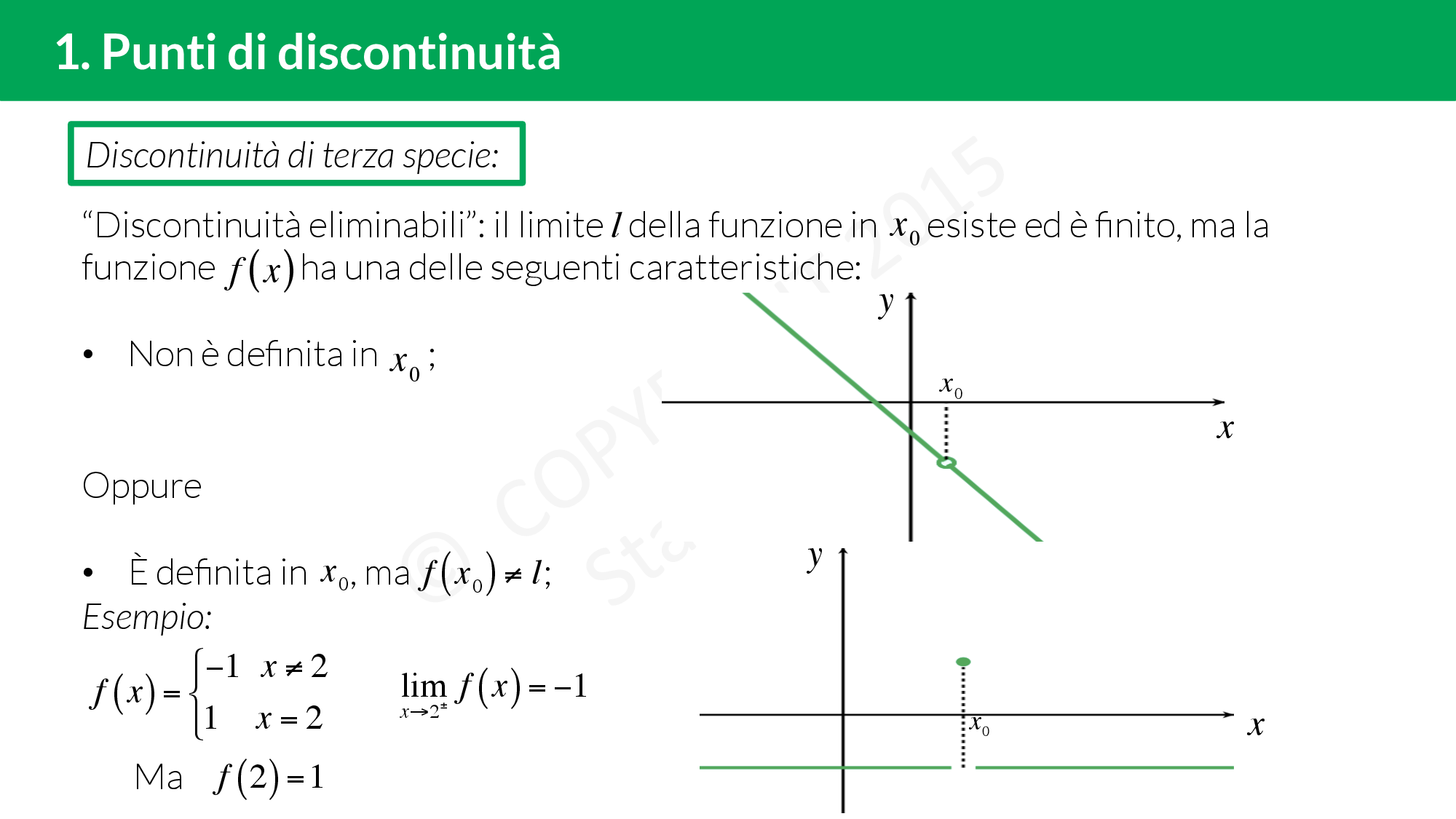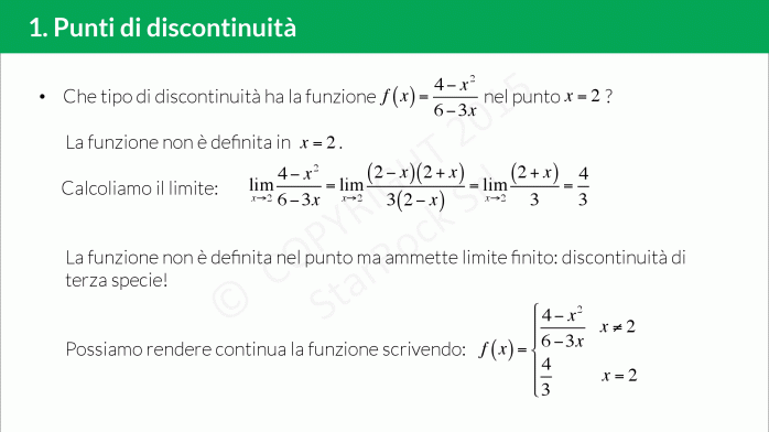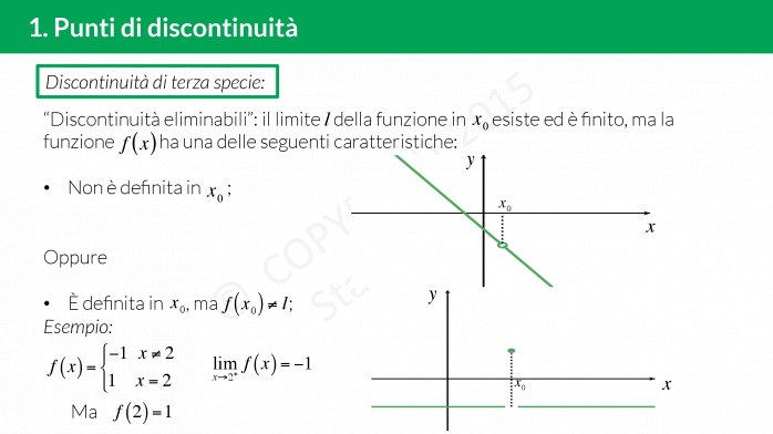Se una funzione non è continua in un punto £$x_0$£, £$x_0$£ è punto di discontinuità. Esistono 3 tipi di discontinuità: