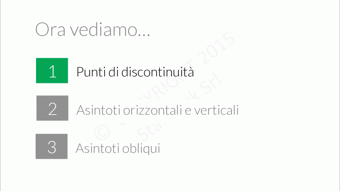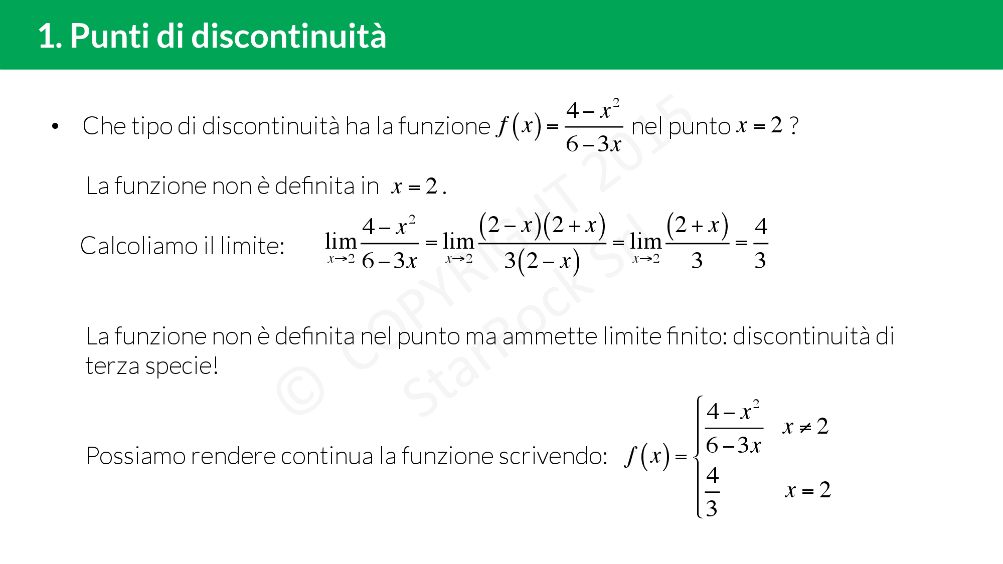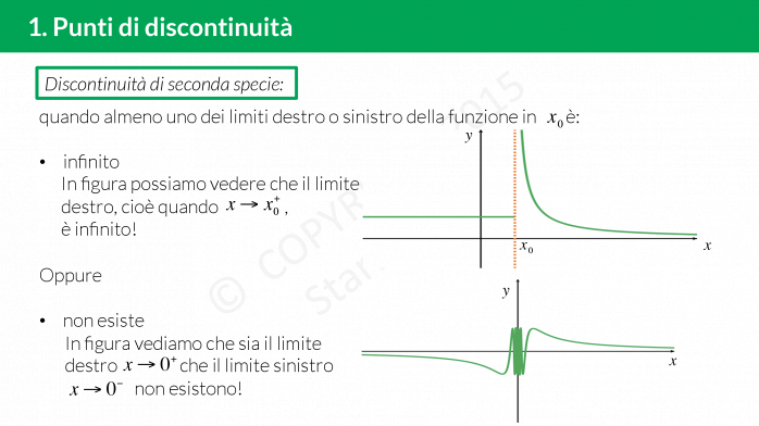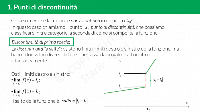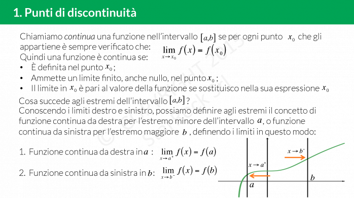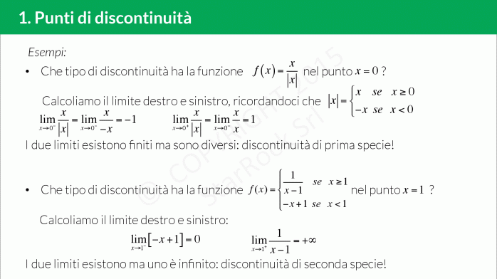 - Punti di discontinuità: definizione di funzione continua, di discontinuità in un punto e di discontinuità di prima, seconda e terza specie