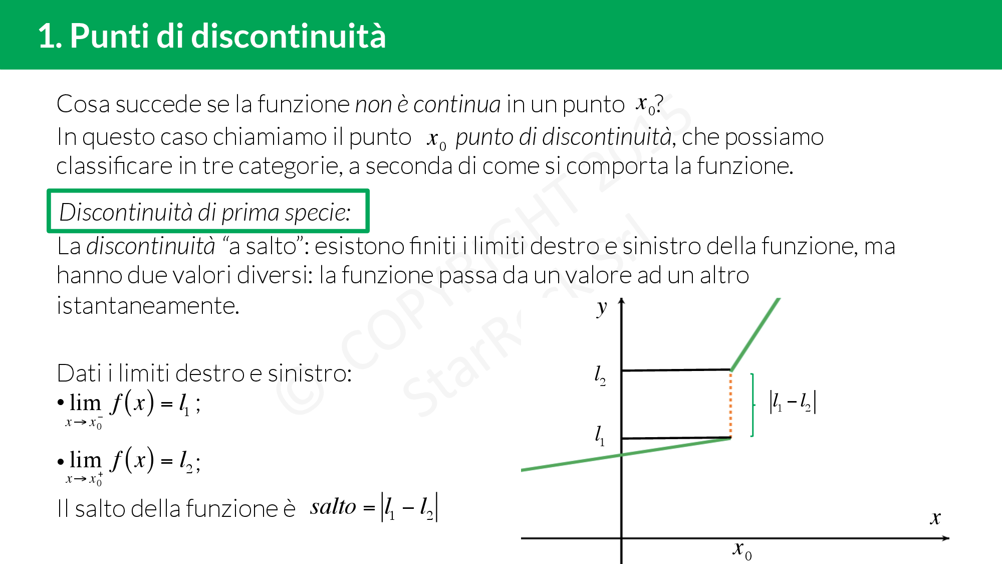 - discontinuità di prima specie ("a salto"): esistono finiti i limiti destro e sinistro della funzione, ma hanno due valori diversi. £$\lim\limits_{x \to x_0^-}f(x)=l_1 \ne \lim\limits_{x \to x_0^+} f(x)=l_2$£