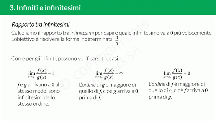 Ci sono funzioni che tendono a infinito o a zero più "velocemente" di altre, più correttamente si dice che ci sono infiniti e infinitesimi di ordine superiore. Sapere in che ordine le funzioni tendono a infinito o a zero e avere quindi un confronto fra infiniti e infinitesimi ci aiuta a risolvere forme indeterminate del tipo £$\frac{\infty}{\infty}$£ o £$\frac{0}{0}$£ che chiamiamo anche rapporto tra infiniti o tra infinitesimi rispettivamente.