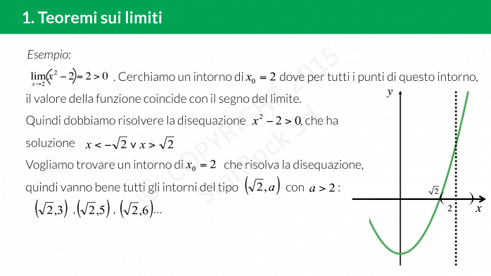 Il teorema della permanenza del segno dice che se £$\lim\limits_{x \to x_0} f(x)=l>0$£ allora esiste un intorno del punto £$x_0$£ tale che £$f(x)>0$£ per ogni £$x$£ appartenente all’intorno. Quindi vicino al punto £$x_0$£ la funzione ed il suo limite hanno lo stesso segno.