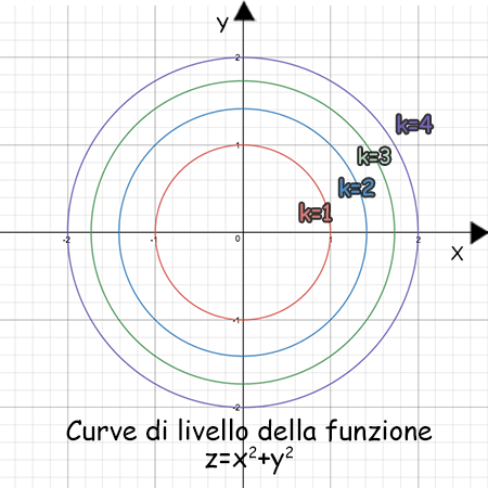 Come disegnare le curve di livello? Abbiamo detto che sono ottenute dall’intersezione tra la funzione e i piani paralleli al piano £$xy$£ che hanno equazione £$z=k$£.