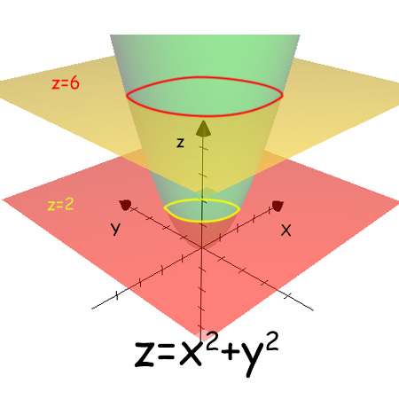In pratica si tratta di “tagliare" (in matematica si dice anche intersecare) la funzione con un piano parallelo al piano £$xy$£ e vedere la curva che salta fuori. L’insieme delle curve ottenute in questo modo sono chiamate curve di livello della funzione.