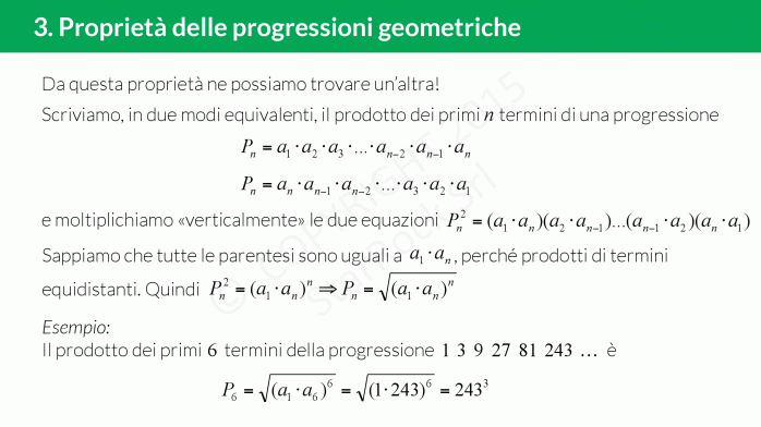Quindi il prodotto dei primi £$n$£ termini della progressione geometrica £$a_{n}$£ è £$P_{n}=\sqrt{(a_{1}\cdot a_{n})^n}$£.