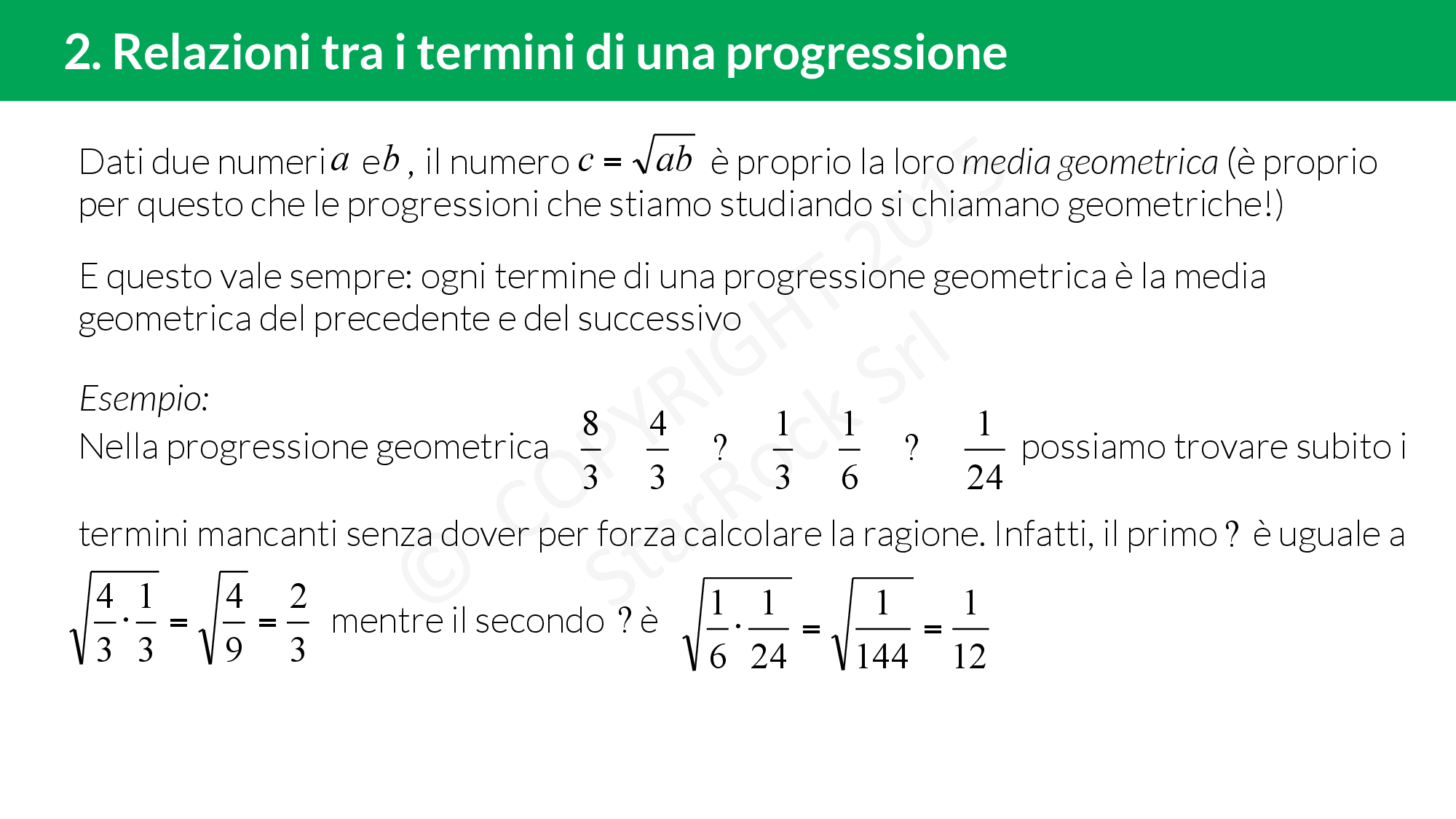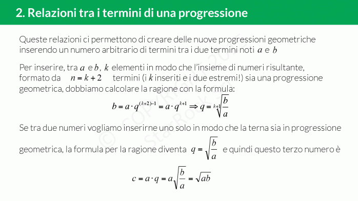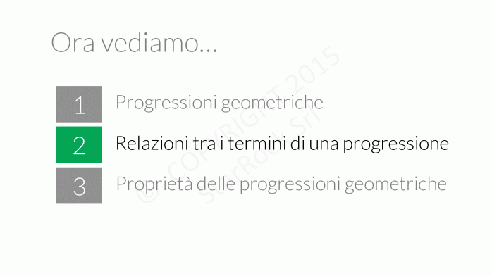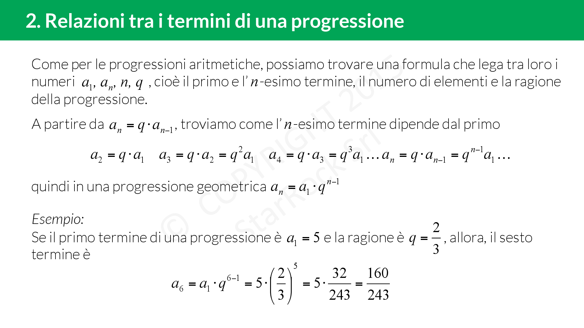 Se £$a_{n}$£ è una progressione geometrica, allora la formula, o relazione, che lega un termine con il suo precedente (tranne il primo) è £$a_{n}=q\cdot a_{n-1}$£ dove £$q$£ è un numero fissato che viene chiamato ragione della progressione.
