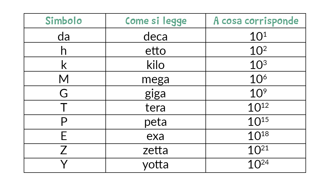 Nella tabella sono elencati i prefissi principali utilizzati per indicare i multipli e i sotto multipli decimali delle unità di misura.
